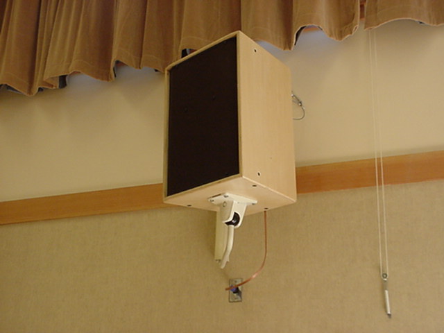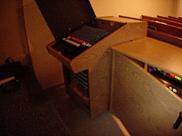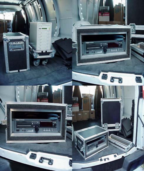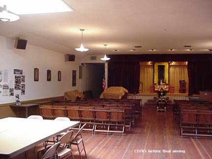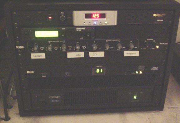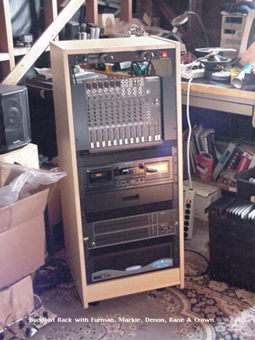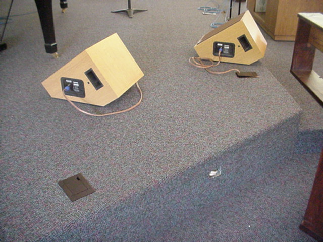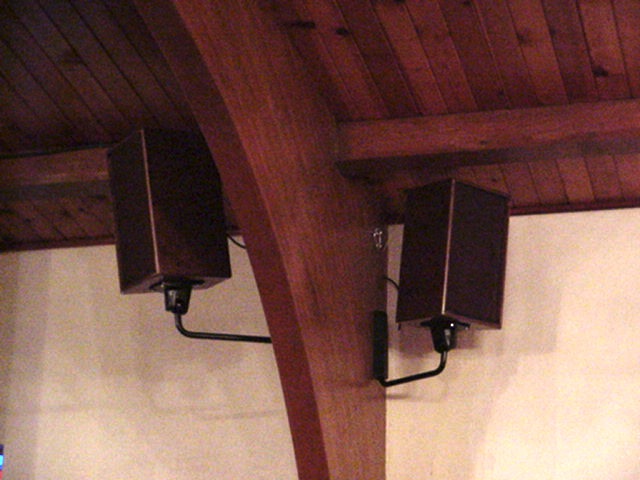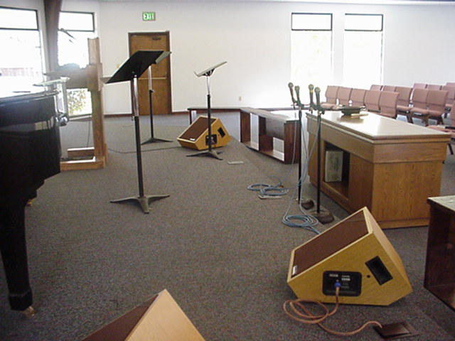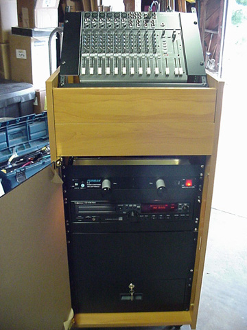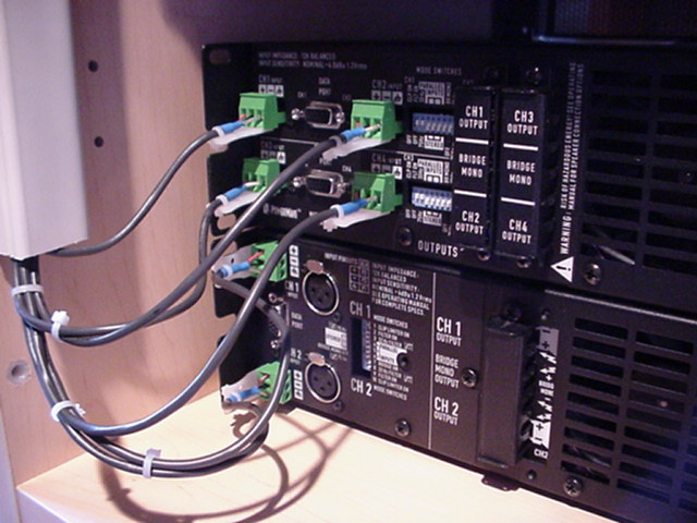 loudspeakers on OmniMounts with Crown power. A Mackie mixer controls